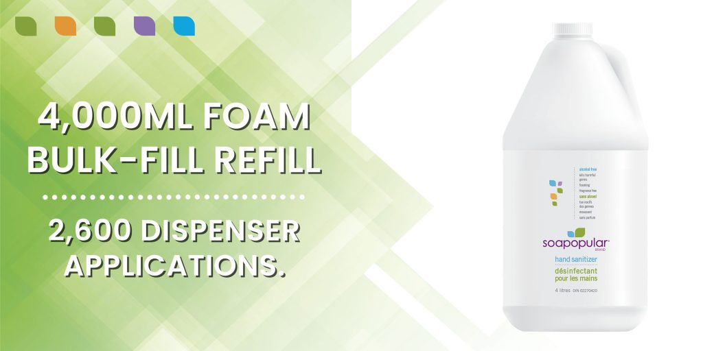 Soapopular® 4L Jug’s are available across all three of our hand hygiene product lines and are assigned unique product codes to communicate the 4L Jug containing your desired hand hygiene product inside. This product listing with the code: #68019 contains Soapopular® Alcohol Free Foam Hand Sanitizer.