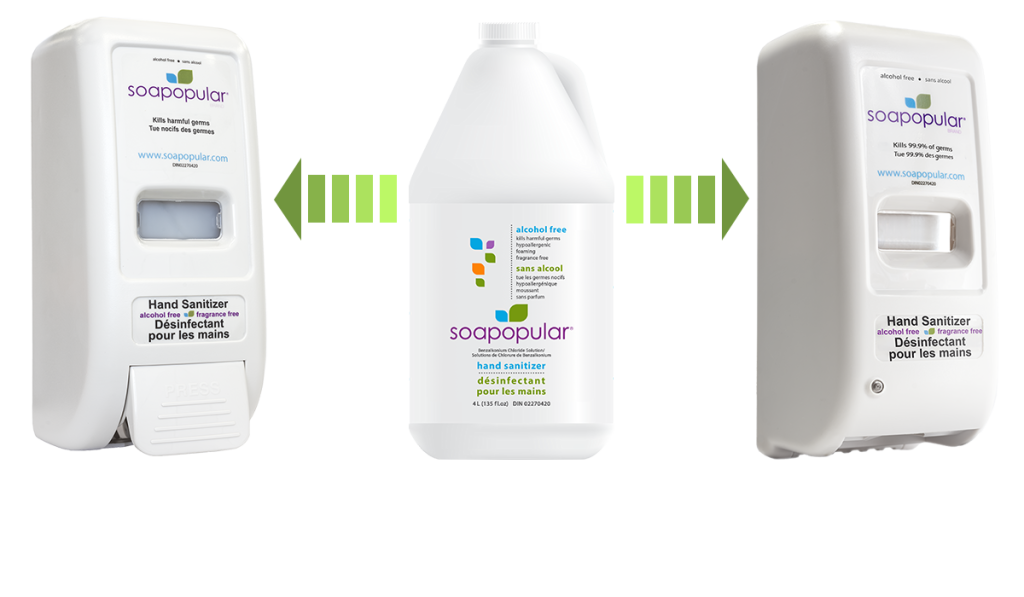 Soapopular® Alcohol Free Hand Sanitizer Bulk-Fill Refill Product Code: 68019, is used to refill our Alcohol Free Manual (68106) and Automatic (68002) dispensers.