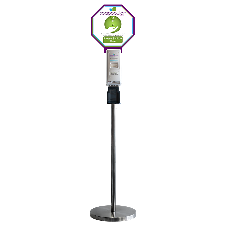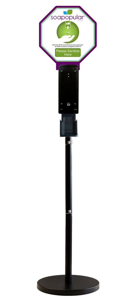 Soapopular® Black-Coated Steel Dispenser Stand is available as a standalone unit, or as a complete deployable unit with an included Automatic Foam Dispenser that is refilled using our Soapopular® Alcohol Free Foam Hand Sanitizer formula.
